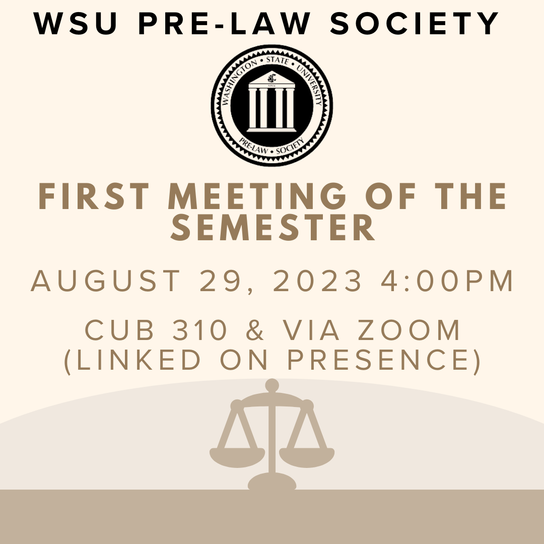 Join us for the first Pre-Law Society meeting of the Fall semester! The Global chapter is combined with the Pullman chapter and this meeting can be attended in CUB 310 on the Pullman campus as well as on the attached zoom link. We are excited and look forward to engaging conversations on important legal issues while preparing tomorrow's future legal leaders!