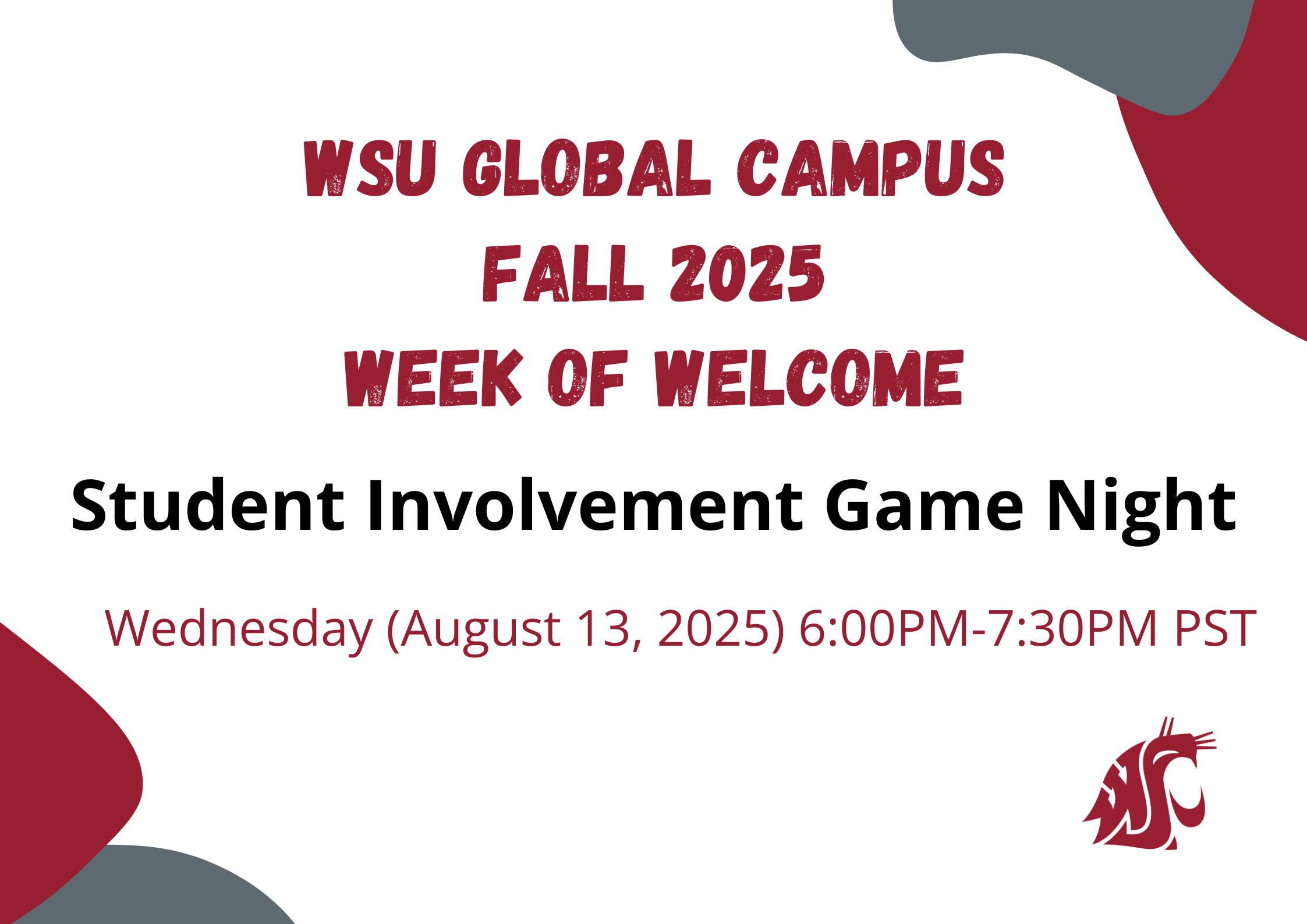 Attend every day of the Week of Welcome to learn about your WSU Global Campus, connect with fellow Cougs, and earn Involvement Points for each event! These points can be redeemed for awesome WSU Global Campus swags. See all Week of Welcome events here: https://connections.wsu.edu/week-of-welcome/. Questions? Please send email to global.connections@wsu.edu.